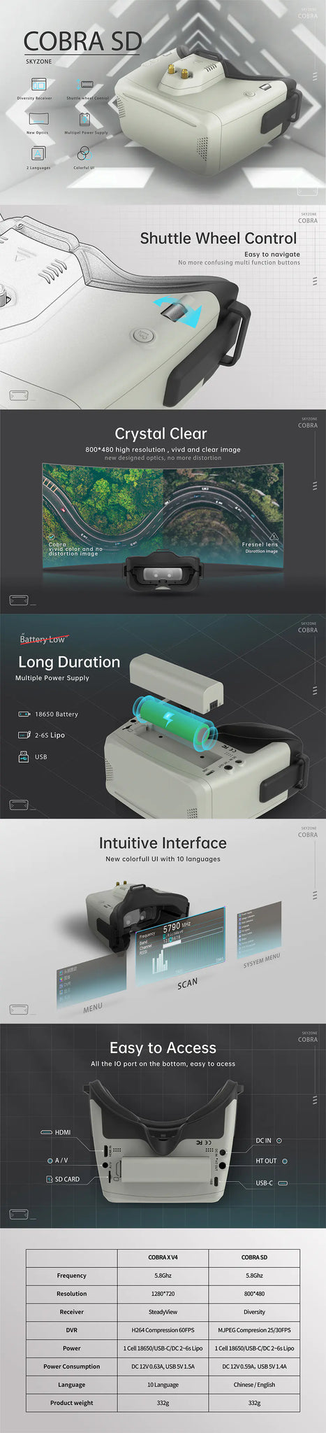 Les lunettes Skyzone Cobra SD sont la version Diversity des lunettes Cobra S et incluent un récepteur Diversity. Les lunettes sont des lunettes FPV 16:9 et disposent d'un écran LCD aux couleurs vives et à haute luminosité, permettant aux pilotes de voir plus de détails pendant la course. Les pilotes peuvent porter des lunettes lorsqu'ils utilisent ces lunettes.