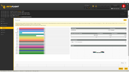 The receiver tab is one of the most essential tabs of Betaflight. It shows how your drone is bound to its radio and channel mappings (what stick/switch does what). It's necessary to verify that your drone is configured correctly before flight to ensure it responds as expected.