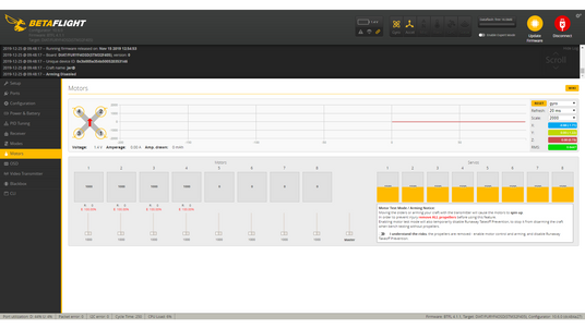 Have you just built your quad or crashed it and wonder if the props are on right? The motor tab can help you test the motor direction to find out. Under this tab, you can manually start or stop all motors and vary their speeds to help determine if the motors are working and spinning in the right direction. Make sure to remove propellers whenever testing the motors via Betaflight.