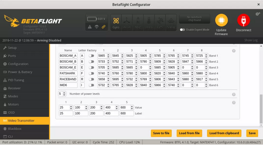 If you are using a supported VTX this tab allows to alter the VTXs power output, channel and more. Please note that most digital systems (such as DJI) do not utilize Betalight compatible firmware and thus will not have access to these features.