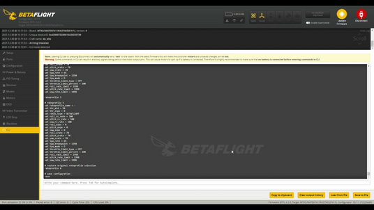 CLI or Command Line Interface is used within Betaflight to configure settings without the use of the GUI, or configure things that are not in the GUI. The CLI can also be used to restore previous configuration via a manufacturer CLI dump, or a previously saved backup of the quads configuration.