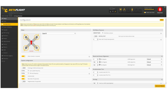 The configuration tab lets you set up some of your quad's basics. Within the configuration tab, you can define some crucial things to flight, such as the motor orientation and direction, ESC and motor protocols, and more. If you have a pre-built quad, you won't need this tab unless you have started altering motors or other hardware.