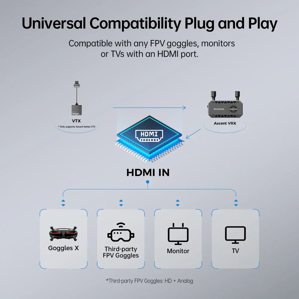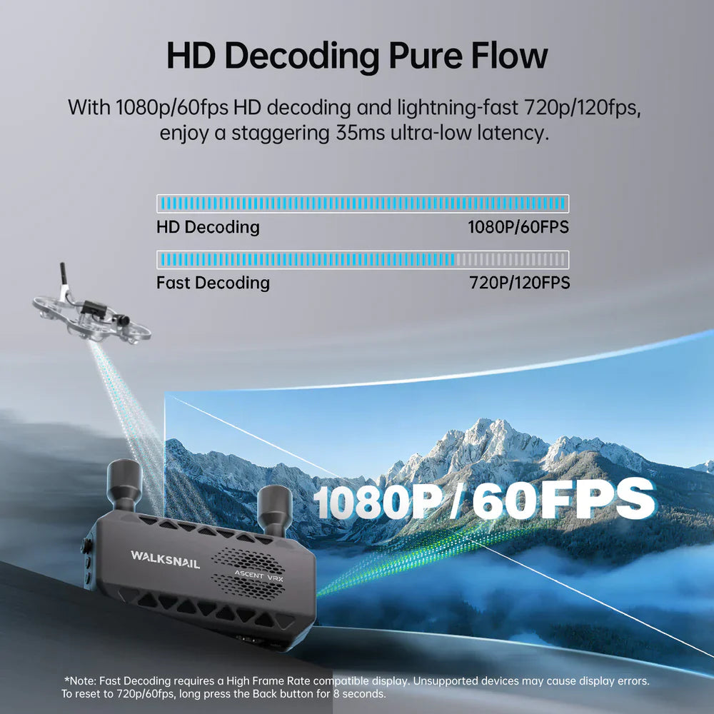 The Walksnail Ascent FPV VRX delivers professional-grade FPV performance with ultra-low 35ms latency and support for 1080P/60fps and 720P/120fps video transmission. Its dual circularly polarized antennas provide rock-solid connectivity up to 6 kilometers with intelligent frequency hopping to minimize interference. Universal HDMI compatibility enables seamless integration with any FPV goggle, monitor, or display for multi-screen operations.